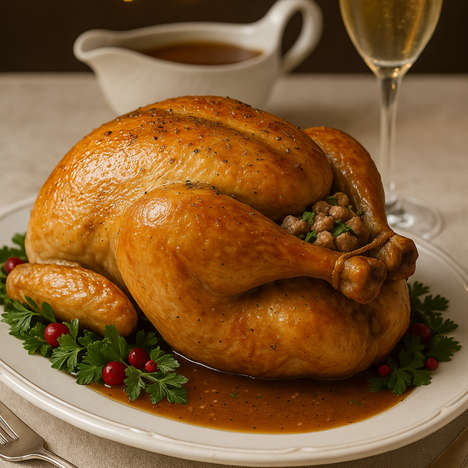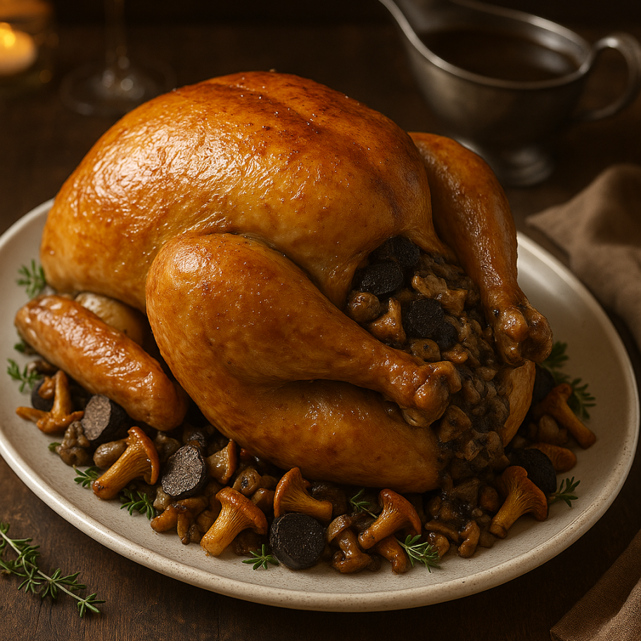 Un chapon cuit lentement pour une tendreté incomparable, garni d’une farce aux champignons sauvages et accompagné d’un jus truffé délicat.