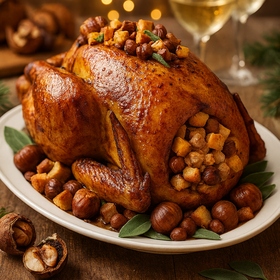 Un chapon généreux garni d’une farce festive mêlant marrons fondants, brioche dorée et foie gras.