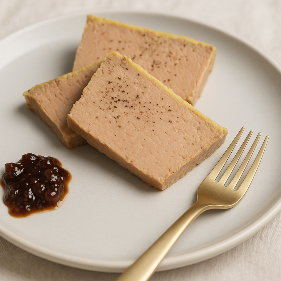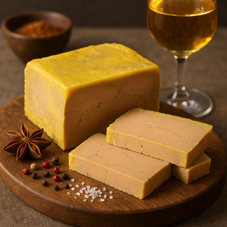 Foie gras français dénervé à la main, assaisonnement précis, une pointe de sucre pour l’équilibre… et, en option, un trait de cognac pour fixer la couleur et sublimer l’aromatique.